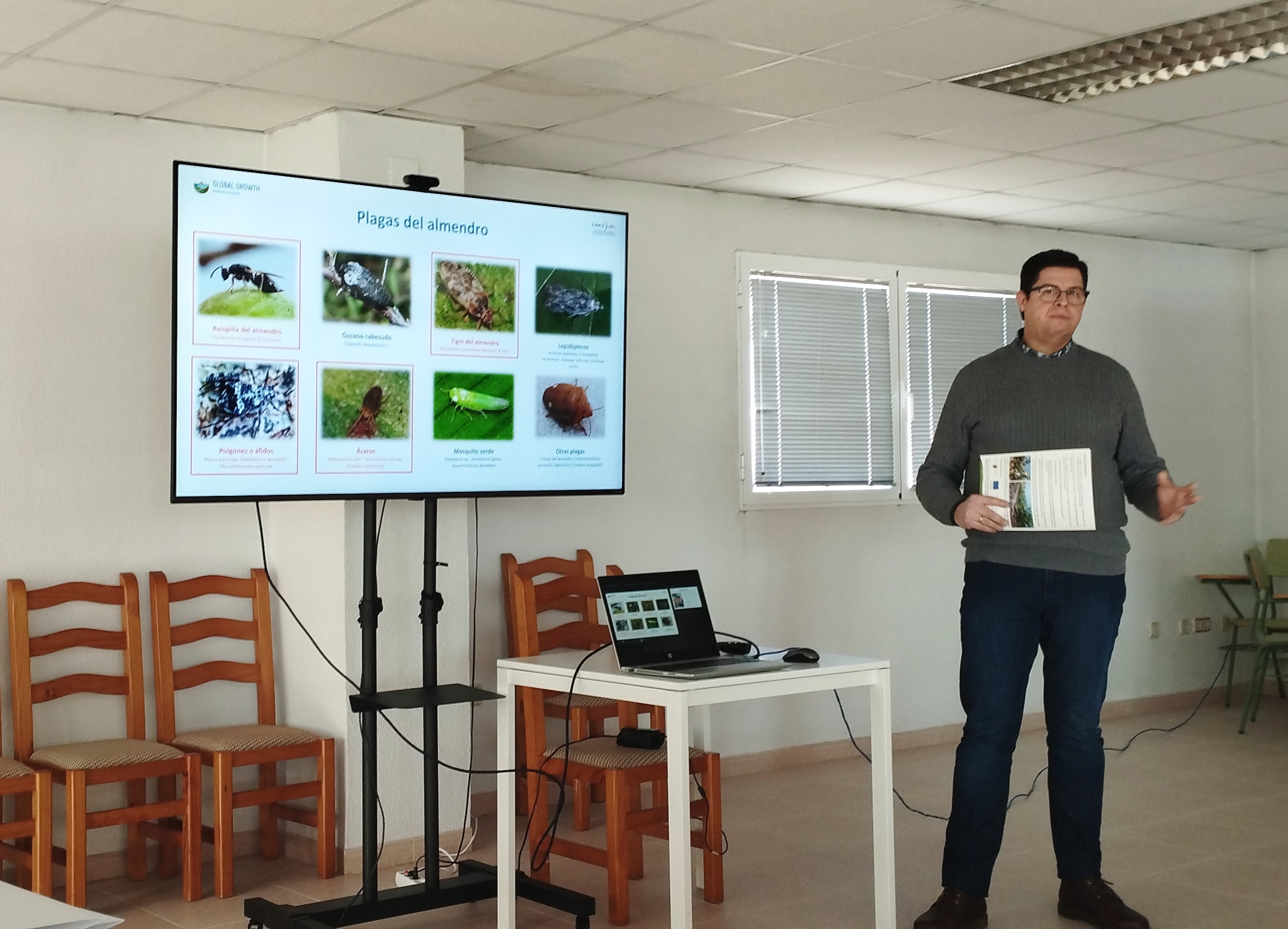 El Equipo de Protección de cultivos del IMIDA junto al Servicio de Sanidad Vegetal de la Consejería de Agua, Agricultura, Ganadería y Pesca, hicieron una presentación a cargo del investigador del IMIDA Modesto del Pino Pérez en la que comentaron los resultados obtenidos hasta la fecha dentro del proyecto FEDER Planes integrales para la mejora de la fitosanidad del almendro y del tomate.
